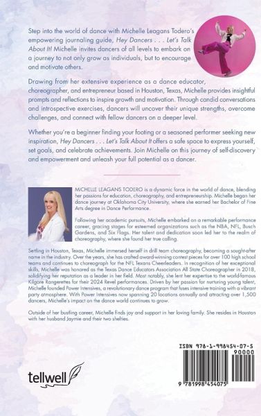 Step into the world of dance with Michelle Leagans Todero's empowering journaling guide, Hey Dancers . . . Let's Talk About It! Michelle invites dancers of all levels to embark on a journey to not only grow as individuals, but to encourage and motivate others. Drawing from her extensive experience as a dance educator, choreographer, and entrepreneur based in Houston, Texas, Michelle provides insightful prompts and reflections to inspire growth and motivation. Through candid conversations and introspective exercises, dancers will uncover their unique strengths, overcome challenges, and connect with fellow dancers on a deeper level. Whether you're a beginner finding your footing or a seasoned performer seeking new inspiration, Hey Dancers . . . Let's Talk About It offers a safe space to express yourself, set goals, and celebrate achievements. Join Michelle on this journey of self-discovery and empowerment and unleash your full potential as a dancer.