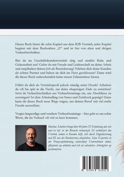 Dieses Buch bietet dir zehn Kapitel aus dem B2B-Vertrieb, jedes Kapitel beginnt mit dem Buchstaben "E" und ist frei von alten und drögen Verkaufstechniken.Bist du im Geschäftskundenvertrieb tätig und strahlst Ruhe und Gelassenheit aus? Gehst du mit Freude und Leidenschaft an deine Arbeit und empfindest deinen Job als Bereicherung? Erleben dich deine Kunden als echten Partner und haben sie dich ins Herz geschlossen? Dann wird dir dieses Buch wahrscheinlich keine neuen Erkenntnisse bieten.Fühlst du dich als Vertriebsprofi jedoch ständig unter Druck? Arbeitest du oft bis spät in die Nacht, um deine ehrgeizigen Ziele zu erreichen? Setzt du Verkaufstechniken aus Verkaufstrainings ein, um Abschlüsse zu erzwingen? Ist dein Arbeitsalltag von Stress und Zeitdruck geprägt? Dann kann dir dieses Buch neue Wege zeigen, um deinen Beruf mit viel mehr Freude auszuüben.Vergiss langweilige und veraltete Verkaufstrainings - hier geht es um echte Werte, die im Verkauf oft viel zu kurz kommen. Entdecke die Kraft authentischer und wertbasierter Verkaufsstrategien und begeistere deine Kunde!