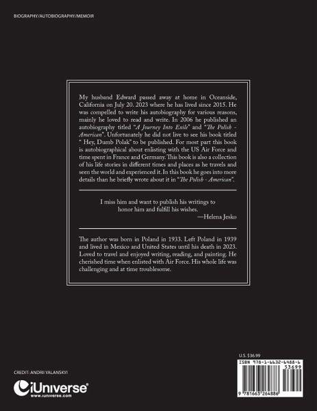 My husband Edward passed away at home in Oceanside, California on July 20. 2023 where he has lived since 2015. He was compelled to write his autobiography for various reasons, mainly he loved to read and write. In 2006 he published an autobiography titled "A Journey Into Exile" and "The Polish -American". Unfortunately he did not live to see his book titled " Hey, Dumb Polak" to be published. For most part this book is autobiographical about enlisting with the US Air Force and time spent in France and Germany. This book is also a collection of his life stories in different times and places as he travels and seen the world and experienced it. In this book he goes into more details than he briefly wrote about it in "The Polish - American".