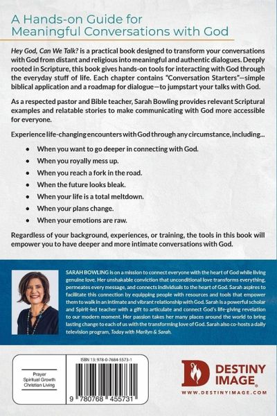 A Hands-on Guide for Meaningful Conversations with God Hey God, Can We Talk? is a practical book designed to transform your conversations with God from distant and religious into meaningful and authentic dialogues. Deeply rooted in Scripture, this book gives hands-on tools for interacting with God through the everyday stuff of life. Each chapter contains "Conversation Starters"-simple biblical application and a roadmap for dialogue-to jumpstart your talks with God. As a respected pastor and Bible teacher, Sarah Bowling provides relevant Scriptural examples and relatable stories to make communicating with God more accessible for everyone. Experience life-changing encounters with God through any circumstance, including...When you want to go deeper in connecting with God. When you royally mess up. When you reach a fork in the road. When the future looks bleak. When your life is a total meltdown. When your plans change. When your emotions are raw. Regardless of your background, experiences, or training, the tools in this book will empower you to have deeper and more intimate conversations with God.