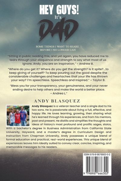 "Sitting in public reading this, and yet again, you have reduced me to tears through your eloquence and strength to say what most of us ignore. Andy, you are an inspiration." ~ Andrew B "This is powerful stuff! As someone who struggles similarly to you, I'm very thankful for your openness and transparency. My tool kit looks very similar, and as I age, the dark and scary days are fewer and farther between. Thank you so much." ~ Kim C. One windy day on a bike ride, training for an Ironman triathlon, Andy Blasquez was blown from his bicycle while traveling at over 40 miles per hour. This accident left him unconscious and alone, out of sight, off the side of the road. But this wasn't his first fall. It wasn't his first concussion.. It was his 15th concussion that was severe enough to result in a loss of consciousness. As a single father of his two sons, with his memories slipping away, replaced by fear and depression, he had to find a way to capture the very best of his life, his growth, life's questions and answers...everything he wanted to share with his sons when they were older. With no time to waste, Andy re-prioritized his life, putting his boys and his mental, physical, and spiritual health right at the top. He needed to live his best life...and he needed to start immediately. This lead to modeling this healthy lifestyle for his boys. Walking and talking with them while they learned, together, to navigate this life with purpose, on purpose, and with a smile. He thought, "If I can learn to navigate this most-challenging time of my life...I know I can help alleviate within them some of the feelings that I wrestled with throughout my childhood. The ultimate purpose being that perhaps they'd go on to bigger and better-- and-more importantly -- happier times." Needing guidance to find patience and understanding, strength and confidence, and ultimately peace, Andy read and processed and re-read writings and teaching from the most revered and inspirational spiritual leaders, mentors, sages, philosophers, and personal development coaches in history. Harvesting insights from contemporaries such as Stephen Covey, Tony Robbins, and Eckhart Tolle to the Buddha, Siddhartha Gautama, to Gandhi. From the Reverend Martin Luther King Jr. to the teachings of the Christian Bible, the Quran, and the Bhagavad Gita. From the ideas passed down from our most prolific Stoics to the time-tested fables of the Tao Te Ching. All of them right. All of them overlapping. In this book Andy shares his past, his sadness and joy, his failures and journeys, and the sea of peaceful and practical wisdom he collected. All of it simplified and distilled, then presented in "Hey Guys. It's Dad!" in a way that's as conversational and comforting as it is inspirational and heartwarming.