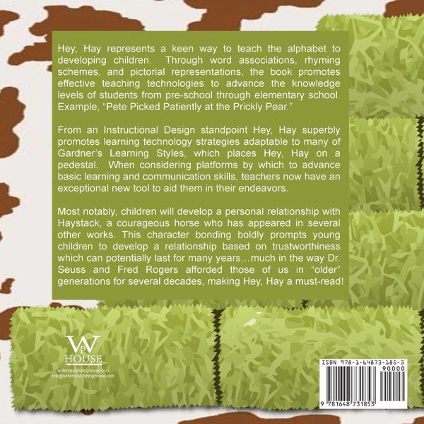 Hey, Hay represents a keen way to teach the alphabet to developing children. Through word associations, rhyming schemes, and pictorial representations, the book promotes effective teaching technologies to advance the knowledge levels of students from pre-school through elementary school. Example, "Pete Picked Patiently at the Prickly Pear." From an Instructional Design standpoint Hey, Hay superbly promotes learning technology strategies adaptable to many of Gardner's Learning Styles, which places Hey, Hay on a pedestal. When considering platforms by which to advance basic learning and communication skills, teachers now have an exceptional new tool to aid them in their endeavors. Most notably, children will develop a personal relationship with Haystack, a courageous horse who has appeared in several other works. This character bonding boldly prompts young children to develop a relationship based on trustworthiness which can potentially last for many years...much in the way Dr. Seuss and Fred Rogers afforded those of us in "older" generations for several decades, making Hey, Hay a must-read!