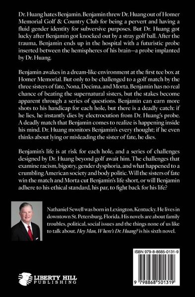 Dr. Huang hates Benjamin. Benjamin threw Dr. Huang out of Homer Memorial Golf & Country Club for being a pervert and having a fluid gender identity for subversive purposes. But Dr. Huang got lucky after Benjamin got knocked out by a stray golf ball. After the trauma, Benjamin ends up in the hospital with a futuristic probe inserted between the hemispheres of his brain-a probe implanted by Dr. Huang. Benjamin awakes in a dream-like environment at the first tee box at Homer Memorial. But only to be challenged to a golf match by the three sisters of fate, Nona, Decima, and Morta. Benjamin has no real chance of beating the supernatural sisters, but the stakes become apparent through a series of questions. Benjamin can earn more shots to his handicap for each hole, but there is a deadly catch: if he lies, he instantly dies by electrocution from Dr. Huang's probe. A deadly match that Benjamin comes to realize is happening inside his mind. Dr. Huang monitors Benjamin's every thought; if he even thinks about lying or misleading the sister of fate, he dies. Benjamin's life is at risk for each hole, and a series of challenges designed by Dr. Huang beyond golf await him. The challenges that examine racism, bigotry, gender dysphoria, and what happened to a crumbling American society and body politic. Will the sisters of fate win the match and Morta cut Benjamin's life short, or will Benjamin adhere to his ethical standard, his par, to fight back for his life? Nathaniel Sewell was born in Lexington, Kentucky. He lives in downtown St. Petersburg, Florida. His novels are about family troubles, political, social issues and the things none of us like to talk about. Hey Man, Where's Dr. Huang? is his sixth novel.