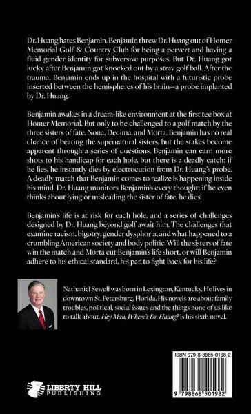 Dr. Huang hates Benjamin. Benjamin threw Dr. Huang out of Homer Memorial Golf & Country Club for being a pervert and having a fluid gender identity for subversive purposes. But Dr. Huang got lucky after Benjamin got knocked out by a stray golf ball. After the trauma, Benjamin ends up in the hospital with a futuristic probe inserted between the hemispheres of his brain-a probe implanted by Dr. Huang. Benjamin awakes in a dream-like environment at the first tee box at Homer Memorial. But only to be challenged to a golf match by the three sisters of fate, Nona, Decima, and Morta. Benjamin has no real chance of beating the supernatural sisters, but the stakes become apparent through a series of questions. Benjamin can earn more shots to his handicap for each hole, but there is a deadly catch: if he lies, he instantly dies by electrocution from Dr. Huang's probe. A deadly match that Benjamin comes to realize is happening inside his mind. Dr. Huang monitors Benjamin's every thought; if he even thinks about lying or misleading the sister of fate, he dies. Benjamin's life is at risk for each hole, and a series of challenges designed by Dr. Huang beyond golf await him. The challenges that examine racism, bigotry, gender dysphoria, and what happened to a crumbling American society and body politic. Will the sisters of fate win the match and Morta cut Benjamin's life short, or will Benjamin adhere to his ethical standard, his par, to fight back for his life? Nathaniel Sewell was born in Lexington, Kentucky. He lives in downtown St. Petersburg, Florida. His novels are about family troubles, political, social issues and the things none of us like to talk about. Hey Man, Where's Dr. Huang? is his sixth novel.