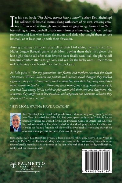 49 Baseball Stories That Will Warm Your Heart! This anthology celebrates parenthood and the powerful influence moms and dads have on their sons' and daughters' lifelong love for baseball. Author Rob Sheinkopf retired from a career in higher education and served as a Luxury Suites Concierge for the San Francisco Giants. At Oracle Park he listened to his guests tell their tales of fandom, oftentimes leading to emotional reminiscences with a parent at the center. This is where Sheinkopf was inspired to write this book; recruiting, collecting, editing and meticulously curating these heartfelt narratives. He has eight of his own stories sprinkled throughout. In this collection, you will read poignant reflections from award-winning authors, college professors, baseball broadcasters, former players, and fellow die-hard fans, offering a rich tapestry of perspectives: Read about a baseball trip this 12 year-old girl will never forget, driving with her dad from Tennessee to Dyersville, Iowa to see her first major league game. Experience a first-hand account from a 97 year-old lifelong baseball fan of spending a 1931 Sunday afternoon in Babe Ruth's New York apartment with many of his teammates and friends. Learn how a man finds the silver lining and long term benefits in never having played catch with his dad. Understand that Opening Day is not the best time to break a tooth, if you're a patient of this Las Vegas dentist. He can always be found in his usual seat every year at Dodger Stadium, as the season begins. Read the touching story how a Pirates pitcher accompanied this high school senior to his school's sports banquet after his father's untimely death. Appreciate the struggle that African American minor league baseball players endured in the 1960's through the perspective of a white teammate, and what price he paid to expose injustice. See how three daughters each learned to love baseball and the Boston Red Sox because of their father's passion for the game, and his ability to relate to each of them. Relive your memories through these heartwarming stories, as you reflect on your own relationship with your mom or dad, and your love of America's National Pastime.