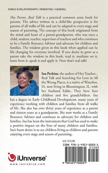 Hey Parent...Real Talk is a practical common sense book for parents. The advice written in a child-like perspective is for parents of all walks of life and can be adapted to every stage and season of parenting. The concept of this book originated from the mind and heart of a parent-grandparent, who was once a child, student, teacher, supervisor of teachers and who continues to be a Family Resource Advisor and advocate for children and families. The wisdom given in this book when applied can be life changing for everyone involved. If you desire to grow as a parent take the wisdom in this book, read it, meditate on it, learn from it, speak it and apply it. Now that's real talk!