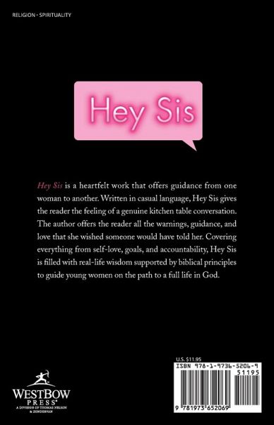 Hey Sis is a heartfelt work that offers guidance from one woman to another. Written in casual language, Hey Sis gives the reader the feeling of a genuine kitchen table conversation. The author offers the reader all the warnings, guidance, and love that she wished someone would have told her. Covering everything from self-love, goals, and accountability, Hey Sis is filled with real-life wisdom supported by biblical principles to guide young women on the path to a full life in God.