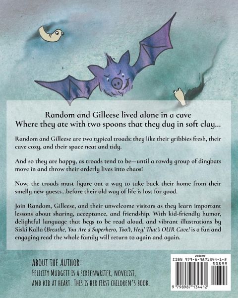 Random and Gilleese lived alone in a cave Where they ate with two spoons that they dug in soft clay... Random and Gilleese are two typical troads: they like their gribbies fresh, their cave cozy, and their space neat and tidy. And so they are happy, as troads tend to be-until a rowdy group of dingbats moves in and throws their orderly lives into chaos! Now, the troads must find a way to take back their home from their smelly new guests...before their old way of life is lost for good. This wacky illustrated children's book for young kids will keep the whole family entertained! Join Random, Gilleese, and their unwelcome visitors in this zany children's book about learning tolerance, sharing, friendship, and acceptance-perfect for any fan of poetry picture books, young or old. With kid-friendly humor, delightful language that begs to be read aloud, and vibrant illustrations by Siski Kalla (Breathe; You Are a Superhero, Too!), Hey! That's OUR Cave! is a fun and engaging read that kids and parents alike will return to again and again.