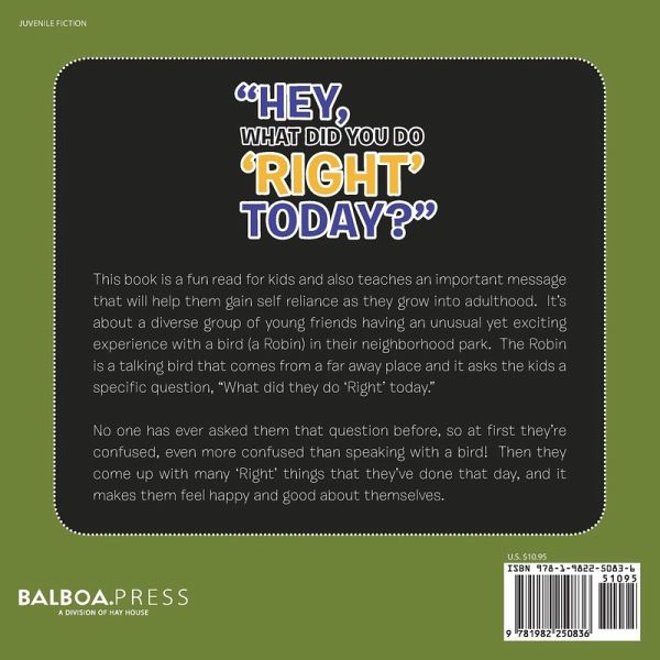 This book is a fun read for kids and also teaches an important message that will help them gain self reliance as they grow into adulthood. It's about a diverse group of young friends having an unusual yet exciting experience with a bird (a Robin) in their neighborhood park. The Robin is a talking bird that comes from a far away place and it asks the kids a specific question, "What did they do 'Right' today." No one has ever asked them that question before, so at first they're confused, even more confused than speaking with a bird! Then they come up with many 'Right' things that they've done that day, and it makes them feel happy and good about themselves.