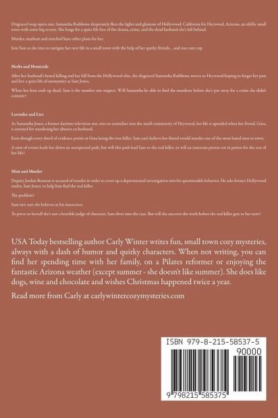 Disgraced soap opera star, Samantha Rathbone desperately flees the lights and glamour of Hollywood, California for Heywood, Arizona, an idyllic small town with some big secrets. She longs for a quiet life free of the drama, crime, and the dead husband she's left behind. Murder, mayhem and mischief have other plans for her. Join Sam as she tries to navigate her new life in a small town with the help of her quirky friends... and one cute cop. Herbs and Homicide After her husband's brutal killing and her fall from the Hollywood elite, the disgraced Samantha Rathbone moves to Heywood hoping to forget her past and live a quiet life of anonymity as Sam Jones. When her boss ends up dead, Sam is the number one suspect. Will Samantha be able to find the murderer before she's put away for a crime she didn't commit? Lavender and Lies As Samantha Jones, a former daytime television star, tries to assimilate into the small community of Heywood, her life is upended when her friend, Gina, is arrested for murdering her abusive ex-husband. Even though every shred of evidence points at Gina being the true killer, Sam can't believe her friend would murder one of the most hated men in town. A turn of events leads her down an unexpected path, but will this path lead Sam to the real killer, or will an innocent person rot in prison for the rest of her life? Mint and Murder Deputy Jordan Branson is accused of murder in order to cover up a departmental investigation into his questionable behavior. He asks former Hollywood starlet, Sam Jones, to help him find the real killer. The problem? Sam isn't sure she believes in his innocence. To prove to herself she's not a horrible judge of character, Sam dives into the case. But will she uncover the truth before the real killer gets to her next?