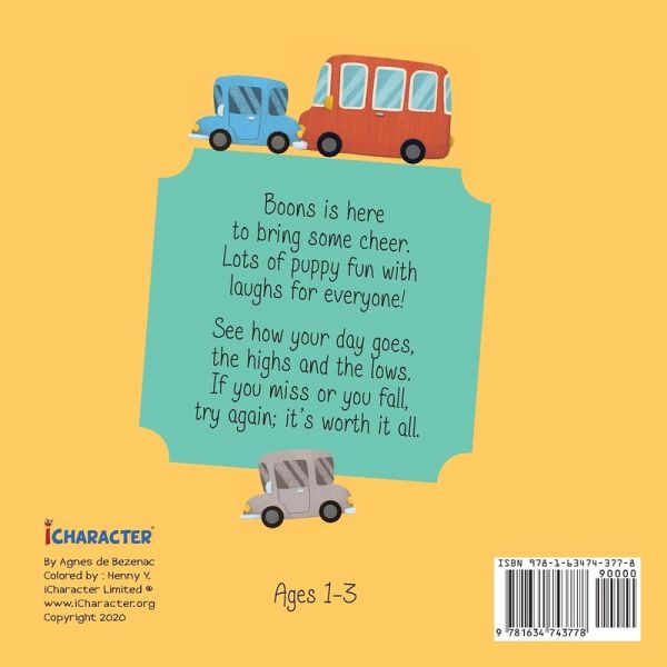 Boons is here to bring some cheer. Lots of puppy fun with laughs for everyone! See how your day goes, the highs and the lows. If you miss or you fall, try again; it's worth it all. See more books & free downloads at www.icharacter.org