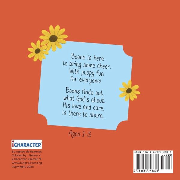 Boons is here to bring some cheer. With puppy fun for everyone! Boons finds out, what God's about. His love and care, is there to share. See more books & free downloads at www.icharacter.org