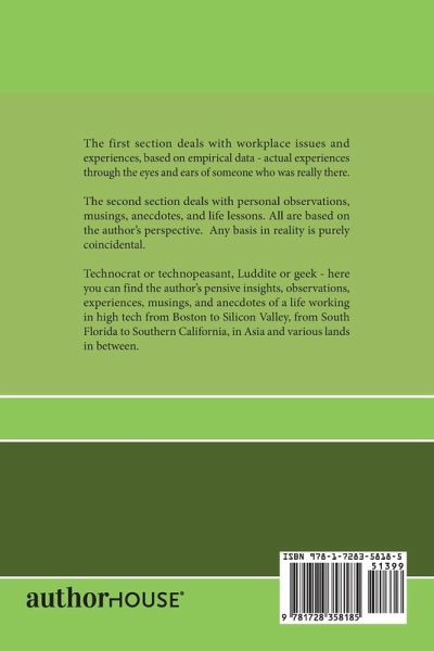 The first section deals with workplace issues and experiences, based on empirical data - actual experiences through the eyes and ears of someone who was really there. The second section deals with personal observations, musings, anecdotes, and life lessons. All are based on the author's perspective. Technocrat or technopeasant, Luddite or geek - here you can find the author's pensive insights, observations, experiences, musings, and anecdotes of a life working in high tech from Boston to Silicon Valley, from South Florida to Southern California, in Asia and various lands in between.