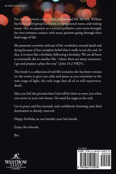 For the last twenty years of her professional life, Beverly Wilkins has been a grief group facilitator, congregational nurse, and visiting nurse. Her occupation as a trained palliative care nurse brought her into intimate contact with many patients going through their final stage of life. She possesses a serenity and ease of the vocabulary around death and dying because of her complete belief that it really is not the end. In fact, it is more like a birthday following a birthday. We are all born to eventually die to another life, "where there are many mansions. I go and prepare a place for you" (John 14:2 NKJV). This book is a collection of real-life scenarios she has been witness to; she wants to give you calm and peace as you transition to the next stage of light, the only stage that all of us will experience: death. May you feel the promise that God will be there to meet you when you arrive in your new home. No need for angst at the end. Go in peace and live joyously and confidently knowing your final destination is already reserved. Happy birthday as you breathe your last breath. Enjoy the whoosh. Bev
