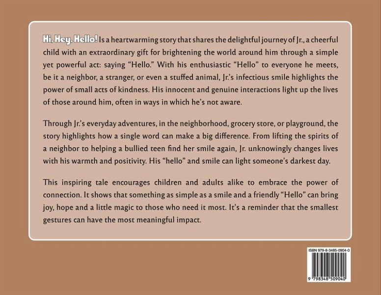 Hi, Hey, Hello! Is a heartwarming story that shares the delightful journey of Jr., a cheerful child with an extraordinary gift for brightening the world around him through a simple yet powerful act: saying "Hello."