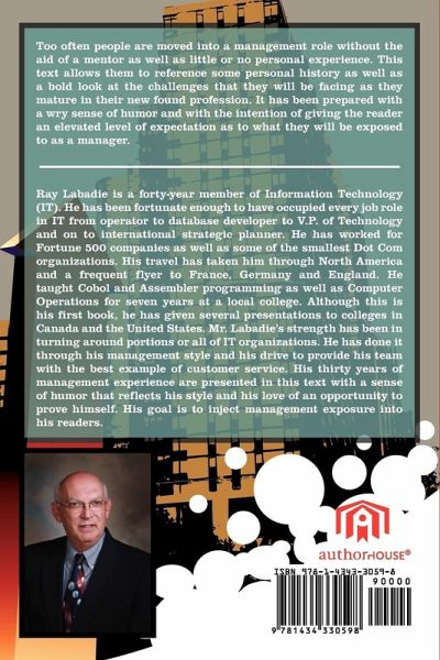 Too often people are moved into a management role without the aid of a mentor as well as little or no personal experience. This text allows them to reference some personal history as well as a bold look at the challenges that they will be facing as they marture in their new found profession. It has been prepared with a wry sense of humor and with the intention of giving the reader an elevated level of expectation as to what they will be exposed to as a manager.