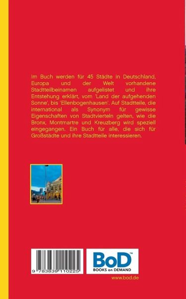 Im Buch werden für 40 Städte in Deutschland, Europa und der Welt vorhandene Stadtteilbeinamen aufgelistet und ihre Entstehung erklärt, vom 'Land der aufgehenden Sonne', bis 'Ellenbogenhausen'. Auf Stadtteile, die international als Synonym für gewisse Eigenschaften von Stadtvierteln gelten, wie die Bronx, Montmartre und Kreuzberg wird speziell eingegangen. Das ganze wird duch ein Kapitel zu Bauwerkebeinamen abgerundet. Ein Buch für alle, die sich für Großstädte und ihre Stadtteile interessieren.