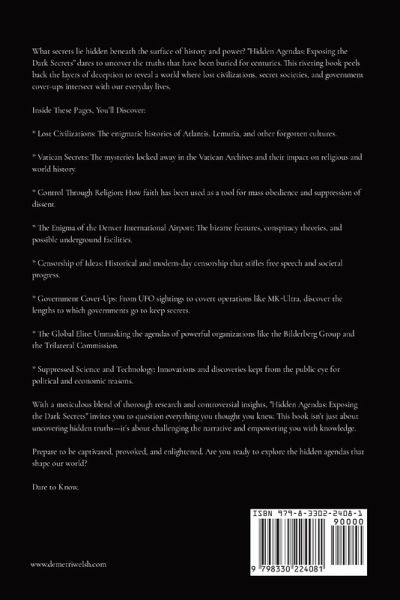 Discover the untold truths hidden in the shadows of history, religion, and global power. "Hidden Agendas: Exposing the Dark Secrets" takes you on a thrilling journey into the depths of suppressed information and controversial revelations. Unveil the mysteries of lost civilizations like Atlantis and Lemuria, explore the secrets locked away in the Vatican Archives, and understand how religion has been used as a tool for mass control. Dive into the enigmatic features of the Denver International Airport, unravel conspiracy theories, and uncover the global elite's hidden agendas. With thoroughly researched content, real references to sensitive documents, and a provocative narrative, this book challenges you to question everything you thought you knew. Engage with this comprehensive exploration that dares to expose the dark secrets shaping our world. Perfect for those who seek the truth beyond the mainstream narratives.