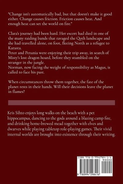 "Change isn't automatically bad, but that doesn't make it good either. Change causes friction. Friction causes heat. And enough heat can set the world on fire." Clara's journey had been hard. Her escort had died in one of the many raiding bands that ravaged the Qoth landscape and she had travelled alone, on foot, fleeing North as a refugee to Karasta. Peter and Petunia were enjoying their trip away, in search of Misty's lost dragon hoard, before they stumbled on the stranger in the jungle. Norman, now facing the weight of responsibility as Magus, is called to face his past. When circumstances throw them together, the fate of the planet rests in their hands. Will their decisions leave the planet in flames?