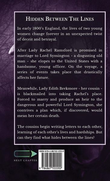 In early 1800's England, the lives of two young women change forever in an unexpected twist of deceit and betrayal. After Lady Rachel Ramsford is promised in marriage to Lord Symington - a disgusting old man - she elopes to the United States with a handsome, young officer. On the voyage, a series of events takes place that drastically affects her future. Meanwhile, Lady Edith Brekmore - her cousin - is blackmailed into taking Rachel's place. Forced to marry and produce an heir to the dangerous and powerful Lord Symington, she contrives a plan which, if discovered, would mean her certain death. The cousins begin writing letters to each other, learning of each other's lives and hardships. But can they find what hides between the lines?