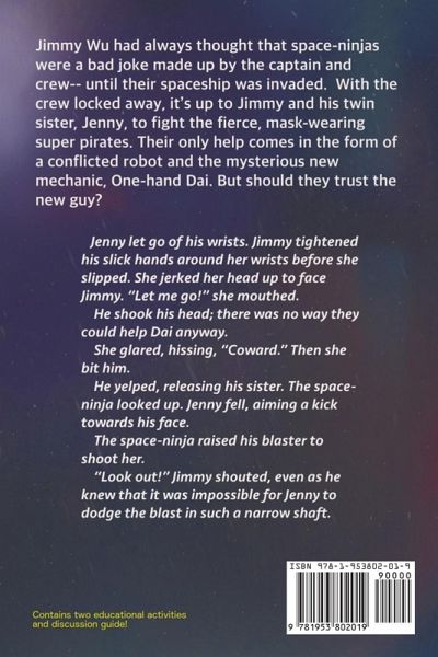 Jimmy Wu had always thought that space-ninjas were a bad joke made up by the captain and crew-- until their spaceship was invaded. With the crew locked away, it's up to Jimmy and his twin sister, Jenny, to fight the fierce, mask-wearing super pirates. Their only help comes in the form of a conflicted robot and the mysterious new mechanic, One-hand Dai. But should they trust him? Jenny let go of his wrists. Jimmy tightened his slick hands around her wrists before she slipped. She jerked her head up to face Jimmy. "Let me go!" she mouthed. He shook his head; there was no way they could help Dai anyway. She glared, hissing, "Coward." Then she bit him. He yelped, releasing his sister. The space-ninja looked up. Jenny fell, aiming a kick towards his face. The space-ninja raised his blaster to shoot her. "Look out!" Jimmy shouted, even as he knew that it was impossible for Jenny to dodge the blast in such a narrow shaft. Contains two educational activities and discussion guide!