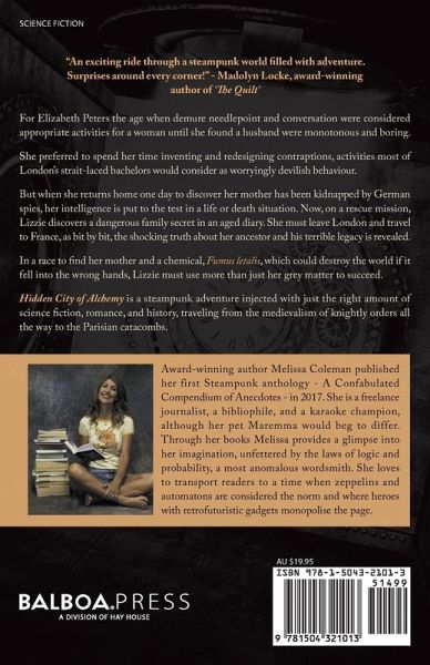 Hidden City of Alchemy is a Steampunk adventure injected with just the right amount of science fiction, romance, and historical fiction, to keep the reader on their toes. A smart and brave heroine with a love for inventing discovers a dangerous family secret in a diary after her mother is kidnapped by German spies. Lizzie must leave London and travel to France while learning the shocking truth about her ancestor and about a chemical which could destroy the world, if it should fall into the wrong hands. AU UPDATE 2.28.2020: "An exciting ride through a steampunk world filled with adventure. Surprises around every corner!" - Madolyn Locke, award-winning author of 'The Quilt' Stand-alone steampunk tale from Melissa Coleman 5-star readers favourite award-winning author of A Confabulated Compendium of Anecdotes and The Halfling. Young English woman, Elizabeth Peters has a ski-sloped nose, a hereditary defect from her father's side. But what is distinguishable about her is her intelligence. She'd rather spend her time inventing gadgets, redesigning engineering contraptions and doing word puzzles than becoming a respectable housewife as her mother wishes. Elizabeth's world is turned upside down one evening when she arrives home to find the house has been ransacked and her mother missing from her basement workshop - presumably kidnapped by German spies. After sifting through the wreckage, she discovers a dangerous family secret in a peculiar-looking cryptic diary, a strange talking ring and a French man - Albert Bourdillon. Lizzie must leave London and travel to France while learning the shocking truth about the owner of the diary and about a chemical which could destroy the world, if it should fall into the wrong hands. A chemical threat so lethal it could destroy herself, the people she loves and the world. Hidden City of Alchemy is a Steampunk adventure injected with just the right amount of science fiction, romance, and historical fiction, to keep the reader on their toes.