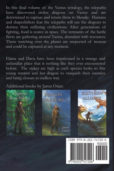 In this final volume of the Vastus tetralogy, the telepaths have discovered stolen dragons on Vastus and are determined to capture and return them to Mendje. Humans and shapeshifters fear the telepaths will use the dragons to destroy their suffering civilizations. After generations of fighting, food is scarce in space. Remnants of the battle fleets are gathering around Vastus, desperate for its abundant resources. Those watching over the planet are suspected of treason and could be captured at any moment. Elaina and Davu have been imprisoned in a strange and unfamiliar place that is nothing like they have ever encountered before. They discover secrets that have been hidden for generations as they fight to defend their home against ruthless invaders and assassins. The stakes are high as each species looks to this young warrior and her dragon to vanquish their enemies and bring closure to endless war.