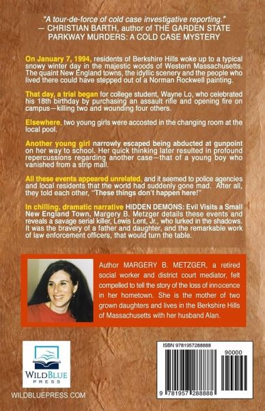 On January 7, 1994, residents of Berkshire Hills woke up to a typical snowy winter day in the majestic woods of Western Massachusetts. The quaint New England towns, the idyllic scenery and the people who lived there could have stepped out of a Norman Rockwell painting. That day, a trial began for college student, Wayne Lo, who celebrated his 18th birthday by purchasing an assault rifle and opening fire on campus-killing two and wounding four others. Elsewhere, two young girls were accosted in the changing room at the local pool. Another young girl narrowly escaped being abducted at gunpoint on her way to school. Her quick thinking later resulted in profound repercussions regarding another case-that of a young boy who vanished from a strip mall. All these events appeared unrelated, and it seemed to police agencies and local residents that the world had suddenly gone mad. After all, they told each other, "These things don't happen here!" In chilling, dramatic narrative HIDDEN DEMONS: Evil Visits a Small New England Town, Margery B. Metzger details these events and reveals a savage serial killer, Lewis Lent, Jr., who lurked in the shadows. It was the bravery of a father and daughter, and the remarkable work of law enforcement officers, that would turn the table.