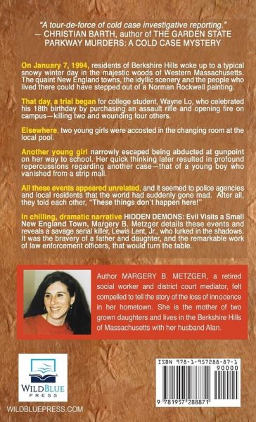 On January 7, 1994, residents of Berkshire Hills woke up to a typical snowy winter day in the majestic woods of Western Massachusetts. The quaint New England towns, the idyllic scenery and the people who lived there could have stepped out of a Norman Rockwell painting. That day, a trial began for college student, Wayne Lo, who celebrated his 18th birthday by purchasing an assault rifle and opening fire on campus-killing two and wounding four others. Elsewhere, two young girls were accosted in the changing room at the local pool. Another young girl narrowly escaped being abducted at gunpoint on her way to school. Her quick thinking later resulted in profound repercussions regarding another case-that of a young boy who vanished from a strip mall. All these events appeared unrelated, and it seemed to police agencies and local residents that the world had suddenly gone mad. After all, they told each other, "These things don't happen here!" In chilling, dramatic narrative HIDDEN DEMONS: Evil Visits a Small New England Town, Margery B. Metzger details these events and reveals a savage serial killer, Lewis Lent, Jr., who lurked in the shadows. It was the bravery of a father and daughter, and the remarkable work of law enforcement officers, that would turn the table.