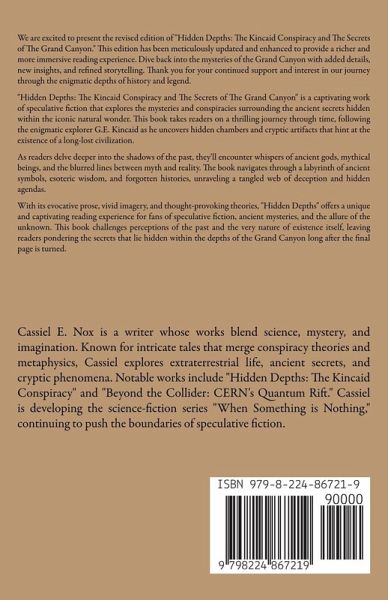 We are excited to present the revised edition of "Hidden Depths: The Kincaid Conspiracy and The Secrets of The Grand Canyon." This edition has been meticulously updated and enhanced to provide a richer and more immersive reading experience. Dive back into the mysteries of the Grand Canyon with added details, new insights, and refined storytelling. Thank you for your continued support and interest in our journey through the enigmatic depths of history and legend. "Hidden Depths: The Kincaid Conspiracy and The Secrets of The Grand Canyon" is a captivating work of speculative fiction that explores the mysteries and conspiracies surrounding the ancient secrets hidden within the iconic natural wonder. This book takes readers on a thrilling journey through time, following the enigmatic explorer G.E. Kincaid as he uncovers hidden chambers and cryptic artifacts that hint at the existence of a long-lost civilization. As readers delve deeper into the shadows of the past, they'll encounter whispers of ancient gods, mythical beings, and the blurred lines between myth and reality. The book navigates through a labyrinth of ancient symbols, esoteric wisdom, and forgotten histories, unraveling a tangled web of deception and hidden agendas. With its evocative prose, vivid imagery, and thought-provoking theories, "Hidden Depths" offers a unique and captivating reading experience for fans of speculative fiction, ancient mysteries, and the allure of the unknown. This book challenges perceptions of the past and the very nature of existence itself, leaving readers pondering the secrets that lie hidden within the depths of the Grand Canyon long after the final page is turned.
