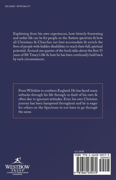 Explaining from his own experiences, how bitterly frustrating and unfair life can be for people on the Autism spectrum & how all Christians & Churches can best accomodate & enrich the lives of people with hidden disabilities to reach their full, spiritual potential. Around one quarter of the book talks about the first 35 years of Mr Treacy's life & how he has been continually held back by such circumstances.