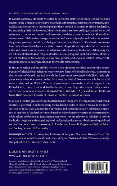 In Hidden Histories, Monique Moultrie collects oral histories of Black lesbian religious leaders in the United States to show how their authenticity, social justice awareness, spirituality, and collaborative leadership make them models of womanist ethical leadership. By examining their life histories, Moultrie frames queer storytelling as an ethical act of resistance to the racism, sexism, and heterosexism these women experience. She outlines these women's collaborative, intergenerational, and leadership styles, and their concerns for the greater good and holistic well-being of humanity and the earth. She also demonstrates how their ethos of social justice activism extends beyond LGBTQ and racialized communities and provides other models of religious and community leadership. Addressing the invisibility of Black lesbian religious leaders in scholarship and public discourse, Moultrie revises modern understandings of how race, gender, and sexual identities interact with religious practice and organization in the twenty-first century.