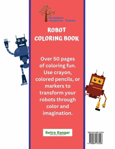 The Hidden Hollow Tales Robot Coloring Book features over 50 pages of coloring fun. Children can exercise their creativity and imagination using crayons, colored pencils, or markers to create colorful pictures of crazy robots.