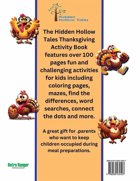 The Hidden Hollow Tales Thanksgiving Activity Book features over 100 pages fun and challenging activities for kids including coloring pages, mazes, find the differences, word searches, connect the dots and more. The Thanksgiving Activity Book also includes a Thanksgiving Bingo Game. A great gift for .parents who want to keep children occupied during meal preparations.