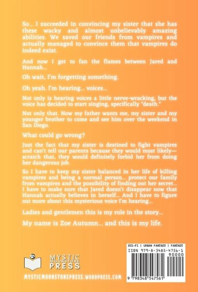 So... I succeeded in convincing my sister that she has these wacky and almost unbelievably amazing abilities. We saved our friends from vampires and actually managed to convince them that vampires do indeed exist. And now I get to fan the flames between Jared and Hannah... Oh wait, I'm forgetting something. Oh yeah. I'm hearing... voices... Not only is hearing voices a little nerve-wracking, but the voice has decided to start singing, specifically "death." Not only that. Now my father wants me, my sister and my younger brother to come and see him over the weekend in San Diego. What could go wrong? Just the fact that my sister is destined to fight vampires and can't tell our parents because they would most likely-scratch that, they would definitely forbid her from doing her dangerous job. So I have to keep my sister balanced in her life of killing vampires and being a normal person... protect our family from vampires and the possibility of finding out her secret... I have to make sure that Jared doesn't disappear now that Hannah actually believes in herself... And I have to figure out more about this mysterious voice I'm hearing... Ladies and gentlemen this is my role in the story...