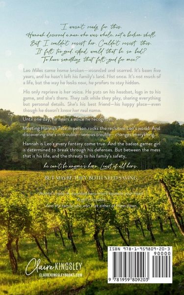 "I wasn't ready for this. Hannah deserved a man who was whole, not a broken shell. But I couldn't resist her. Couldn't resist this. It felt too good. And would that be so bad? To have something that felt good for once?" Leo Miles came home broken-wounded and scarred. It's been five years, and he hasn't left his family's land. Not once. It's not much of a life, but the way he looks now, he prefers to stay hidden. His only reprieve is her voice. He puts on his headset, logs in to his game, and she's there. They talk while they play, sharing everything but personal details. She's his best friend-his happy place-even though he doesn't know her real name. Until one day, he hears a voice he recognizes. Meeting Hannah Tate in person rocks reclusive Leo's world. And discovering she's in trouble-serious trouble-changes everything. Hannah is Leo's every fantasy come true. And the badass gamer girl is determined to break through his defenses. But between the mess that is his life, and the threats to his family's safety, he can't be anyone's hero. Least of all hers. But maybe they both need saving. Author's note: A wounded hero who'll squeeze your heart. A girl in trouble. And the family who won't let either of them down.