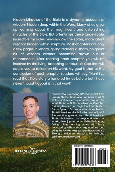 In "Hidden Miracles of the Bible," commercial pilot and Air Force veteran Brent Furrow takes readers on a remarkable journey through Scripture, revealing subtle yet profound insights that most readers miss when focusing only on the Bible's grand miracles. Like a skilled aviator navigating through clouds to find clear skies, Furrow guides readers past the obvious to discover the quiet wisdom lying just beneath the surface of familiar biblical stories. Drawing from his unique perspective as someone who has crossed continents and cultures, Furrow brings fresh eyes to ancient texts. Each concise chapter acts as a spiritual waypoint, offering readers sharp, memorable insights that will transform their understanding of well-known biblical passages. These bite-sized revelations are perfect for daily reflection, designed to make readers pause and think, "I've read this story a hundred times, but I've never seen it quite like this!" Written with the precision of a pilot and the wonder of a world traveler, this book doesn't get bogged down in heavy theology or lengthy exposition. Instead, it offers clear, compelling insights that will rejuvenate your faith and help you see God's word in an entirely new light. Whether you're a lifelong believer or someone newly exploring faith, these hidden miracles will help you navigate the deeper waters of Scripture with confidence and joy. Perfect for busy modern readers, each chapter delivers profound wisdom in just a few pages, making it ideal for daily devotionals or group Bible study. "Hidden Miracles of the Bible" reveals how God's word, like the sky itself, holds endless wonders for those who know where to look. About the Author: >A lifelong learner, Furrow holds a B.A. in Speech Communication from Eastern Illinois University and an MS in Recreation, Sport, & Tourism Management from the University of Illinois. His achievement of Eagle Scout rank early in life set the foundation for a life of service and exploration, whether in the air, on mountain slopes, or through the pages of Scripture. Based in Holiday Shores, Illinois, Furrow balances his professional flying career with outdoor adventures, including boating, hiking, and skiing the Rockies. His commitment to community service and deep Christian faith inform both his writing and his life's work. As a Lutheran and lifelong Christian, he brings both devotion and analytical precision to his exploration of biblical wisdom.