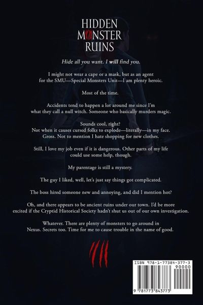 Hide all you want. I will find you. I might not wear a cape or a mask, but as an agent for the SMU-Special Monsters Unit-I am plenty heroic. Most of the time. Accidents tend to happen a lot around me since I'm what they call a null witch. Someone who basically murders magic. Sounds cool, right? Not when it causes cursed folks to explode-literally-in my face. Gross. Not to mention I hate shopping for new clothes. Still, I love my job even if it is dangerous. Other parts of my life could use some help, though. My parentage is still a mystery. The guy I liked, well, let's just say things got complicated. The boss hired someone new and annoying, and did I mention hot? Oh, and there appears to be ancient ruins under our town. I'd be more excited if the Cryptid Historical Society hadn't shut us out of our own investigation. Whatever. There are plenty of monsters to go around in Nexus. Secrets too. Time for me to cause trouble in the name of good.