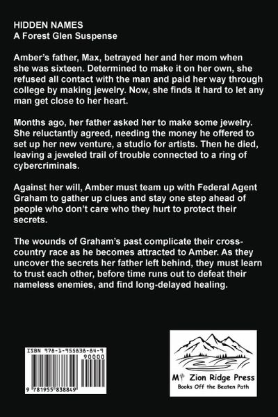 A Forest Glen Suspense Amber's father, Max, betrayed her and her mom when she was sixteen. Determined to make it on her own she refused all contact with the man and paid her way through college by making jewelry. Now, she finds it hard to let any man get close to her heart. Months ago, he asked her to make some jewelry. She reluctantly agreed, needing the money he offered to set up her new venture, a studio for artists. Then he died, leaving a jeweled trail of trouble connected to a ring of cybercriminals. Against her will, Amber must team up with Federal Agent Graham to gather up clues and stay one step ahead of people who don't care who they hurt to protect their secrets. The wounds of Graham's past complicate their cross-country race as he becomes attracted to Amber. As they uncover the secrets her father left behind, they must learn to trust each other, before time runs out to defeat their nameless enemies, and find long-delayed healing.