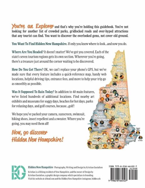 Think of Hidden New Hampshire as your resource for finding wonderful and little-known treasures around the Granite State. Some you always meant to visit, and some you never knew existed! We'll reveal what's right around the corner, explain how to get there, and give you tips on what to expect. In this edition, we've got 40 different features, covering every part of the state. You can ride a boat to an ocean hotel, explore a working Colonial Fort, or find the last upside-down covered bridge in America. Region-by-region directories provide dozens of additional ideas, or can be used to enhance a trip you've already got planned. You're an Explorer and that's why you're holding this guidebook. You're not looking for another list of crowded parks, gridlocked roads and over-hyped attractions that any tourist can find. You want to discover the overlooked gems, not cover old ground.You want To find Hidden New Hampshire. If only you knew where to look...and now you do. Where are you headed? It doesn't matter! We've got you covered. Each of the state's seven tourism regions gets its own section. Wherever you're going, there's a treasure just around the corner waiting to be discovered. How do you get there? OK, we can't replace your phone's GPS, but we've made sure that every feature includes a quick-reference map, handy web locations, helpful driving tips, entrance fees, and more to help your trip go as smoothly as possible. Was It Supposed To Rain Today? In addition to 40 main features, we've listed hundreds of additional locations. Find nearby art exhibits and museums for soggy days, beaches for hot days, parks for relaxing days, and golf courses, because...golf! We hope you've packed your camera, sunscreen, swimsuit, hiking shoes, insect repellent and a sweater. Where you're going, you may need them all!