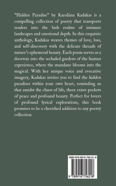 "Hidden Paradise" by Karoliina Kadakas is a compelling collection of poetry that transports readers into the lush realms of intimate landscapes and emotional depth. In this exquisite anthology, Kadakas weaves themes of love, loss, and self-discovery with the delicate threads of nature's ephemeral beauty. Each poem serves as a doorway into the secluded gardens of the human experience, where the mundane blooms into the magical. With her unique voice and evocative imagery, Kadakas invites you to find the hidden paradises within your own heart, reminding us that amidst the chaos of life, there exists pockets of peace and profound beauty. Perfect for lovers of profound lyrical explorations, this book promises to be a cherished addition to any poetry collection. Copyright © 2024 Book Fairy Publishing