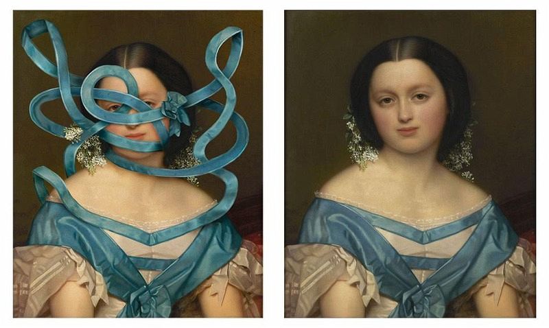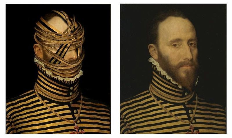 Ein Spiel zwischen Verhüllen und Entblößen, nah und fern zugleich, ein Dialog zwischen Auge und Zeit, Volker Hermes zieht uns mit seinen Werken in den Bann. Männer- und Frauenporträts, gemalt von großen Meistern, werden mit Masken, Stoffen, Perücken, Kragen, Ketten verdeckt.
