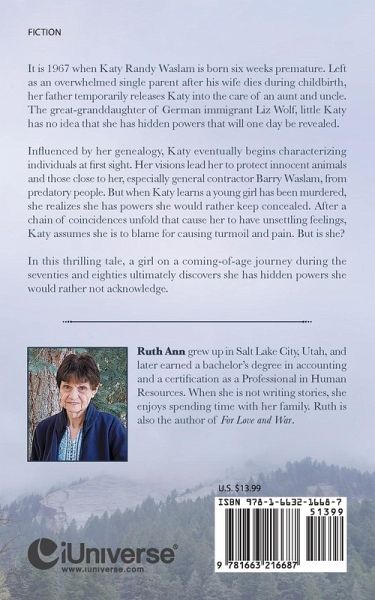 It is 1967 when Katy Randy Waslam is born six weeks premature. Left as an overwhelmed single parent after his wife dies during childbirth, her father temporarily releases Katy into the care of an aunt and uncle. The great-granddaughter of German immigrant Liz Wolf, little Katy has no idea that she has hidden powers that will one day be revealed. Influenced by her genealogy, Katy eventually begins characterizing individuals at first sight. Her visions lead her to protect innocent animals and those close to her, especially general contractor Barry Waslam, from predatory people. But when Katy learns a young girl has been murdered, she realizes she has powers she would rather keep concealed. After a chain of coincidences unfold that cause her to have unsettling feelings, Katy assumes she is to blame for causing turmoil and pain. But is she? In this thrilling tale, a girl on a coming-of-age journey during the seventies and eighties ultimately discovers she has hidden powers she would rather not acknowledge.