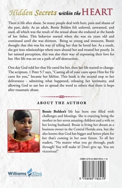 There is life after abuse. So many people deal with hurt, pain and shame of the past, daily. As an adult, Bessie Bolden felt unloved, unwanted, and used, all which was the result of the sexual abuse she endured at the hands of her father. This behavior started when she was six years old and continued until she was thirteen. Being so young and innocent, Bessie thought that this was his way of telling her that he loved her. As a result, she got into relationships where men abused her and treated her poorly. In her tainted perception, this was also their way of expressing their love for her. Her life was set on a path of self-destruction.One day God told her that He cared for her, then her life started to change. The scripture, 1 Peter 5:7 says, "Casting all of your cares upon Him for He cares for you," became her lifeline. This book is the second step to her deliverance - admitting what happened, releasing her testimony, and allowing God to use her to spread the word to others that there is hope after traumatic abuse.