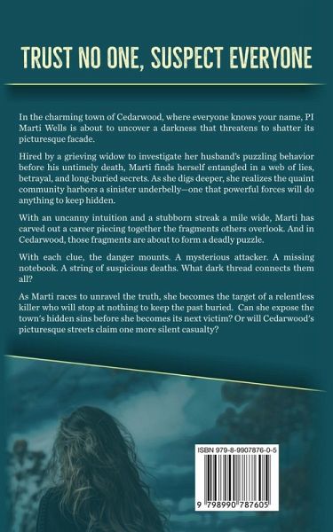 Trust no one, suspect everyone. In the charming town of Cedarwood, where everyone knows your name, PI Marti Wells is about to uncover a darkness that threatens to shatter its picturesque facade. Hired by a grieving widow to investigate her husband's puzzling behavior before his untimely death, Marti finds herself entangled in a web of lies, betrayal, and long-buried secrets. As she digs deeper, she realizes the quaint community harbors a sinister underbelly - one that powerful forces will do anything to keep hidden. With an uncanny intuition and a stubborn streak a mile wide, Marti has carved out a career piecing together the fragments others overlook. And in Cedarwood, those fragments are about to form a deadly puzzle. With each clue, the danger mounts. A mysterious attacker. A missing notebook. A string of suspicious deaths. What connects them all? As Marti races to unravel the truth, she becomes the target of a relentless killer who will stop at nothing to keep the past buried. Can she expose the town's hidden sins before she becomes the next victim?
