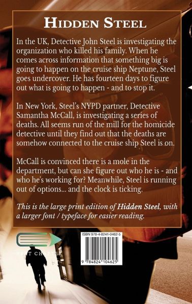 In the UK, Detective John Steel is investigating the organization who killed his family. When he comes across information that something big is going to happen on the cruise ship Neptune, Steel goes undercover. He has fourteen days to figure out what is going to happen - and to stop it. In New York, Steel's NYPD partner, Detective Samantha McCall, is investigating a series of deaths. All seems run of the mill for the homicide detective until they find out that the deaths are somehow connected to the cruise ship Steel is on. McCall is convinced there is a mole in the department, but can she figure out who he is - and who he's working for? Meanwhile, Steel is running out of options... and the clock is ticking. This is the large print edition of Hidden Steel, with a larger font / typeface for easier reading.