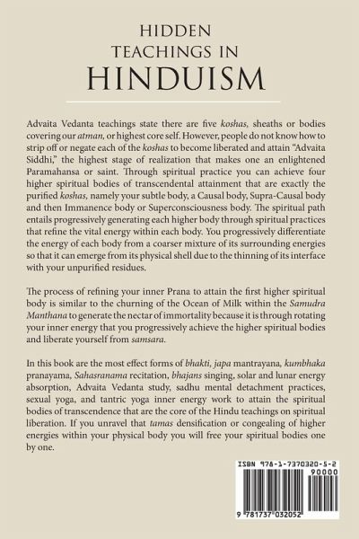 Many people know about the Advaita Vedanta teachings on the five koshas, sheaths or bodies covering our atman, or highest core self. However, people do not know how to strip off or negate each of the lower koshas to become liberated and attain "Advaita Siddhi," the highest stage of realization of the Self that thereby makes one an enlightened Paramahansa or saint. The pathway to nirvikalpa samadhi is certainly available in Hinduism but several non-denominational principles from other spiritual traditions fill in missing details to make its teachings more coherent. The fact is that you potentially have four higher spiritual bodies of transcendental attainment that are exactly the purified koshas, namely your subtle body (which leaves your physical body upon death), a Causal body, Supra-Causal body and then Immanence body or Superconsciousness body. Second, the spiritual path essentially entails progressively generating each higher body through various practices that refine the vital energy within your present body. You progressively differentiate the energy of your subtle body from a coarser mixture of internal energies so that it can emerge from your physical shell due to the thinning of its interface with your unpurified residues. The miraculous powers of the Hindu saints arise because they attain these bodies and use them in various ways rather than because they think about something and then it magically manifests. To attain these higher spiritual bodies that reside on heavenly planes you must cultivate an elevated mental life along with virtuous behavior and activities, and refine your Prana through special practices (i.e. worship, mantra, yoga, pranayama, etc.) that purify it to a high enough degree to differentiate it from your body's ocean of coarser vitality. Then the first of these bodies can finally escape from your physical body of matter. In this book are the most effect forms of bhakti, japa mantrayana, kumbhaka pranayama, Sahasranama recitation, bhajans singing, solar and lunar energy absorption, Advaita Vedanta study, sadhu mental detachment practices, sexual yoga, and tantric yoga inner energy work to attain the spiritual bodies of transcendence that are the core of the Hindu teachings on spiritual liberation. If you unravel that tamas densification or congealing of higher energies within your physical body you will free your spiritual bodies one by one.