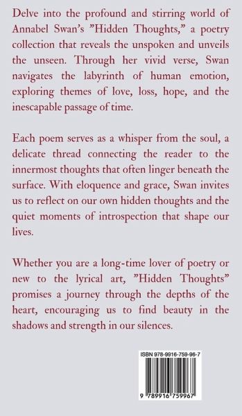 Delve into the profound and stirring world of Annabel Swan's "Hidden Thoughts," a poetry collection that reveals the unspoken and unveils the unseen. Through her vivid verse, Swan navigates the labyrinth of human emotion, exploring themes of love, loss, hope, and the inescapable passage of time. Each poem serves as a whisper from the soul, a delicate thread connecting the reader to the innermost thoughts that often linger beneath the surface. With eloquence and grace, Swan invites us to reflect on our own hidden thoughts and the quiet moments of introspection that shape our lives. Whether you are a long-time lover of poetry or new to the lyrical art, "Hidden Thoughts" promises a journey through the depths of the heart, encouraging us to find beauty in the shadows and strength in our silences. Copyright © 2024 Book Fairy Publishing