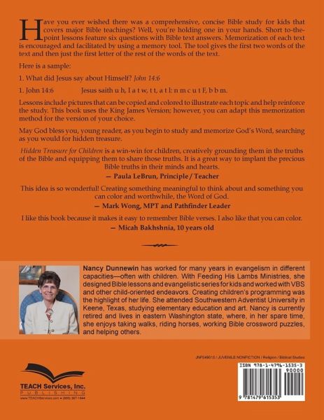 Have you ever wished there was a comprehensive, concise Bible study for kids that covers major Bible teachings? Well, you're holding one in your hands. Short to-the-point lessons feature six questions with Bible text answers. Memorization of each text is encouraged and facilitated by using a memory tool. The tool gives the first two words of the text and then just the first letter of the rest of the words of the text. Here is a sample: 1. What did Jesus say about Himself? John 14:6 1. John 14:6 Jesus saith u h, I a t w, t t, a t l: n m c u t F, b b m. Lessons include pictures that can be copied and colored to illustrate each topic and help reinforce the study. This book uses the King James Version; however, you can adapt this memorization method for the version of your choice. May God bless you, young reader, as you begin to study and memorize God's Word, searching as you would for hidden treasure. Hidden Treasure for Children is a win-win for children, creatively grounding them in the truths of the Bible and equipping them to share those truths. It is a great way to implant the precious Bible truths in their minds and hearts. ~ Paula LeBrun, Principle / Teacher This idea is so wonderful! Creating something meaningful to think about and something you can color and worthwhile, the Word of God. ~ Mark Wong, MPT and Pathfinder Leader I like this book because it makes it easy to remember Bible verses. I also like that you can color. ~ Micah Bakhshnia, 10 years old
