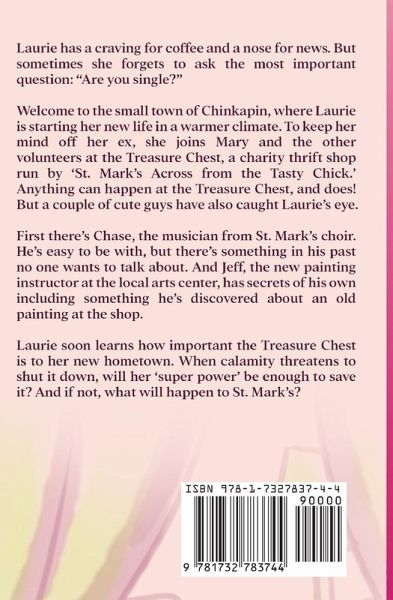 Welcome to the small town of Chinkapin, Georgia, where recently-divorced Laurie Lanton is starting her new life in a warmer climate. To keep her mind off her ex, Laurie joins Mary and the other volunteers at the Treasure Chest, a charity thrift shop run by 'St. Mark's Across from the Tasty Chick.' Anything can happen at the Treasure Chest - and does. Two robberies, a leaky roof, and an invasion of mice give Laurie plenty to think about. But a couple of new men have also caught her attention. Will she pick Chase, the interesting and talented musician from St. Mark's choir? He sure is easy to be with, but there's something in his past no one wants to talk about. And just when things are heating up between them, Laurie overhears something that throws their future into doubt. And what about Jeff, the new painting instructor at the local arts center? He seems to have a few secrets of his own, including something he's discovered about an old painting at the thrift shop. Laurie is shocked when the painting fetches $1.7 million in a New York art auction. Not only that, Jeff intends to keep the money for himself! Laurie has to find a way to convince Jeff to share the money. Will her 'super power' do the trick? Because if she can't, the Treasure Chest might have to close down, and then what will happen to St. Mark's?
